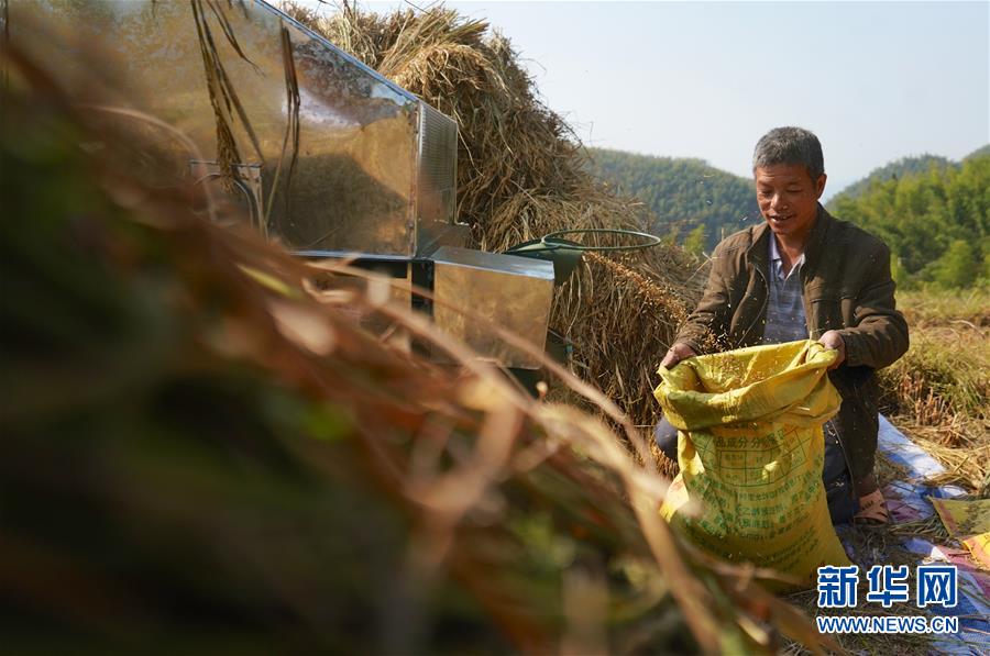 10月9日,一名村民在上堡鄉(xiāng)的高山梯田利用機械進行脫粒裝袋。 新華社記者 胡晨歡 攝