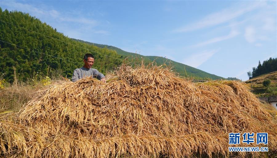 10月9日,一名村民在上堡鄉(xiāng)的高山梯田整理稻草垛。 新華社記者 胡晨歡 攝