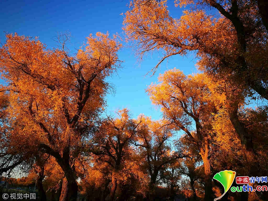 中國青年網(wǎng)北京10月9日電 2018年10月7日至8日,內(nèi)蒙古自治區(qū)阿拉善盟額濟納旗,地處巴丹吉林沙漠。額濟納河兩岸壯觀的胡楊林堪稱大漠的一顆綠色明珠,每年深秋時節(jié)的第一場秋霜過后,大片的胡楊樹葉由綠變黃,一眼望去,陽光下金色的樹葉襯著湛藍的天空于風中婆娑起舞,鮮明的影調(diào),亮麗的色彩,令人流連忘返。