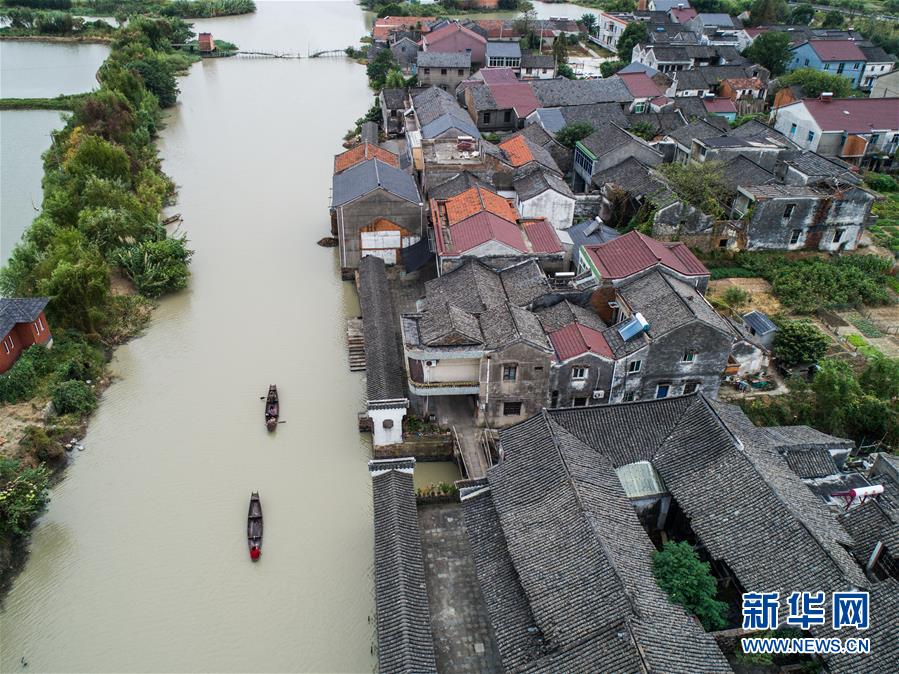 10月10日,泉家潭村村民劃著小船經(jīng)過(guò)沿河長(zhǎng)廊(無(wú)人機(jī)拍攝)。經(jīng)過(guò)改造提升后,沿河長(zhǎng)廊和整潔的古村街巷成為當(dāng)?shù)孛利愢l(xiāng)村的景觀帶。 新華社記者 徐昱 攝