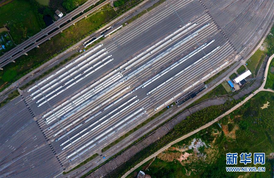 這是廣西南寧動車所內(nèi)準備發(fā)往各地的動車組列車(7月1日無人機拍攝)。 廣西壯族自治區(qū)成立60年來,鐵路建設(shè)發(fā)生翻天覆地的變化。來自中國鐵路南寧局集團有限公司的數(shù)據(jù)顯示,1958年廣西鐵路總里程為1346.3公里,如今廣西鐵路總里程達5191公里。廣西與周邊相鄰省份間實現(xiàn)動車“公交化”開行。此外,北部灣港—重慶班列、東盟海產(chǎn)品冷鏈班列、“百色一號”果蔬專列等的開通和運營,強化了鐵路供給的針對性和有效性。鐵路成為助推廣西經(jīng)濟社會快速發(fā)展的“大動脈”。 新華社記者黃孝邦攝