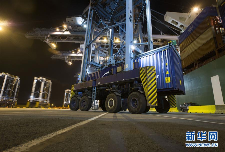 10月15日晚,在比利時(shí)澤布呂赫港集裝箱碼頭,跨運(yùn)車運(yùn)送集裝箱。 新華社記者 葉平凡 攝