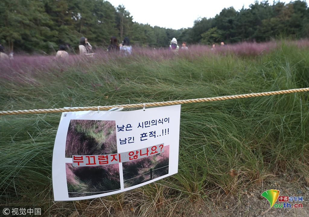 韓國蔚山,近日,蔚山公園大片粉黛亂子草盛開,但部分花海遭游客隨意踩踏。公園并沒有修復(fù)遭破壞區(qū)域,而是用繩索圍起并掛上批判性告示,呼吁游客腳下留情。圖片作者:Yonhap News Agency