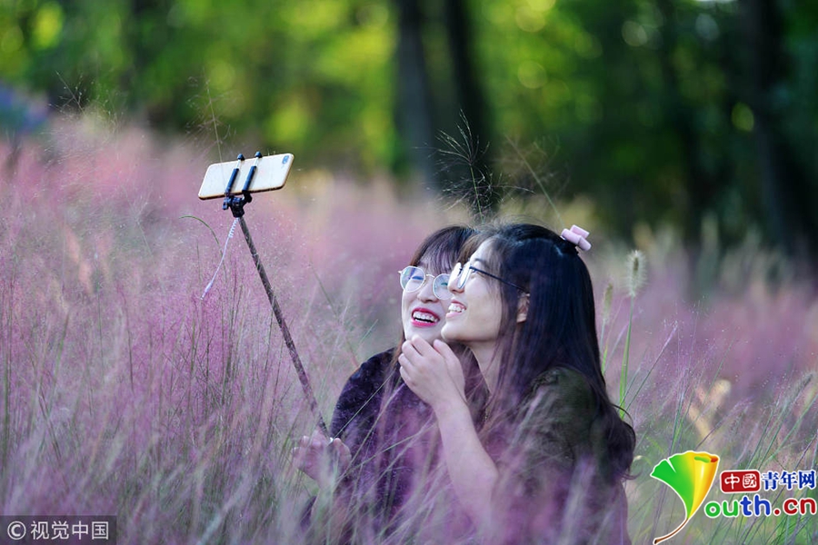 中國青年網(wǎng)北京10月7日電 2018年10月6日,游客在“粉色田野”里游玩、留影。粉黛亂子草是一種觀賞草種,該植物夏季為主要生長季,全株綠色,花期為9月中旬至11月中旬,開花時,綠葉為底,粉紫色花穗如發(fā)絲從基部長出,遠看如紅色云霧。