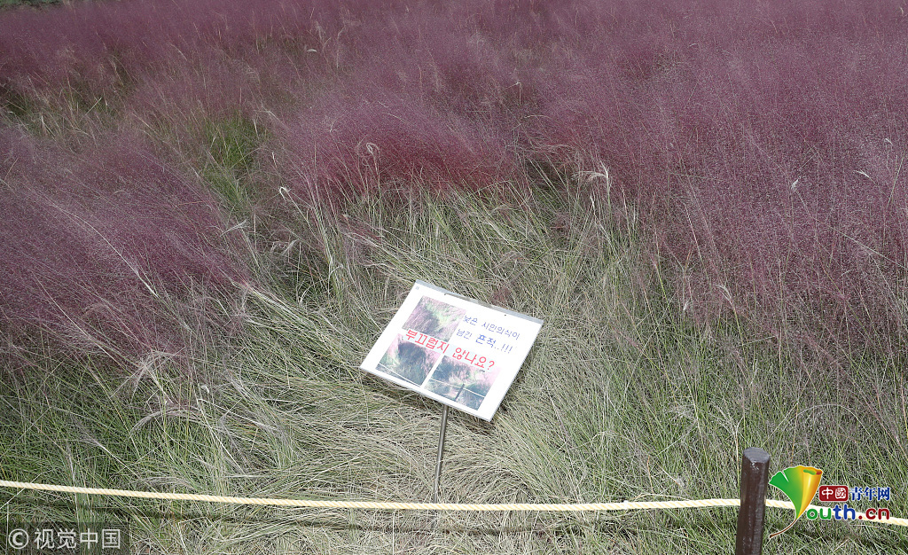 當?shù)貢r間2018年10月16日,韓國蔚山,近日,蔚山公園大片粉黛亂子草盛開,粉紅花海浪漫十足,但部分花海遭游客隨意踩踏。公園并沒有修復(fù)遭破壞區(qū)域,而是用繩索圍起并掛上批判性告示,呼吁游客腳下留情。圖片作者:Yonhap News Agency