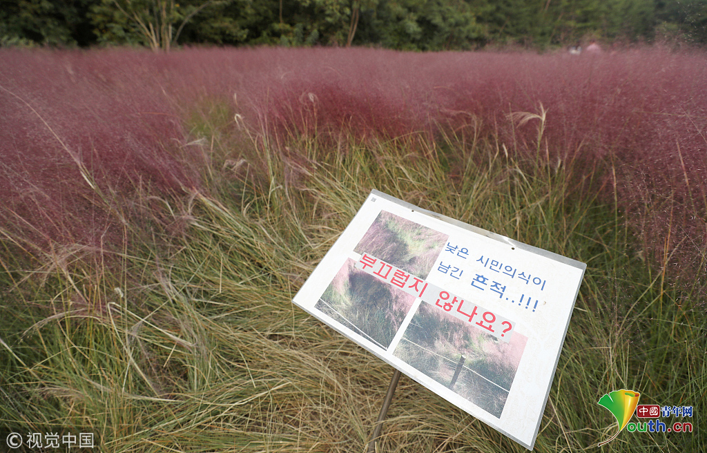 當(dāng)?shù)貢r間2018年10月16日,韓國蔚山,近日,蔚山公園大片粉黛亂子草盛開,粉紅花海浪漫十足,但部分花海遭游客隨意踩踏。圖片作者:Yonhap News Agency