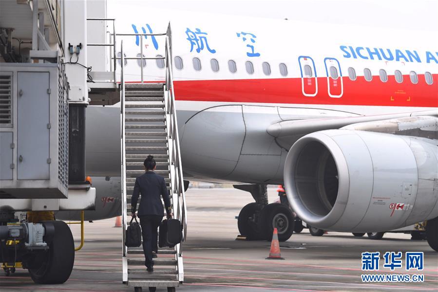 10月16日,航班抵達(dá)重慶江北國際機(jī)場后,湯春燕第一個(gè)走出艙門,準(zhǔn)備迎接旅客下機(jī)。 新華社記者王全超攝