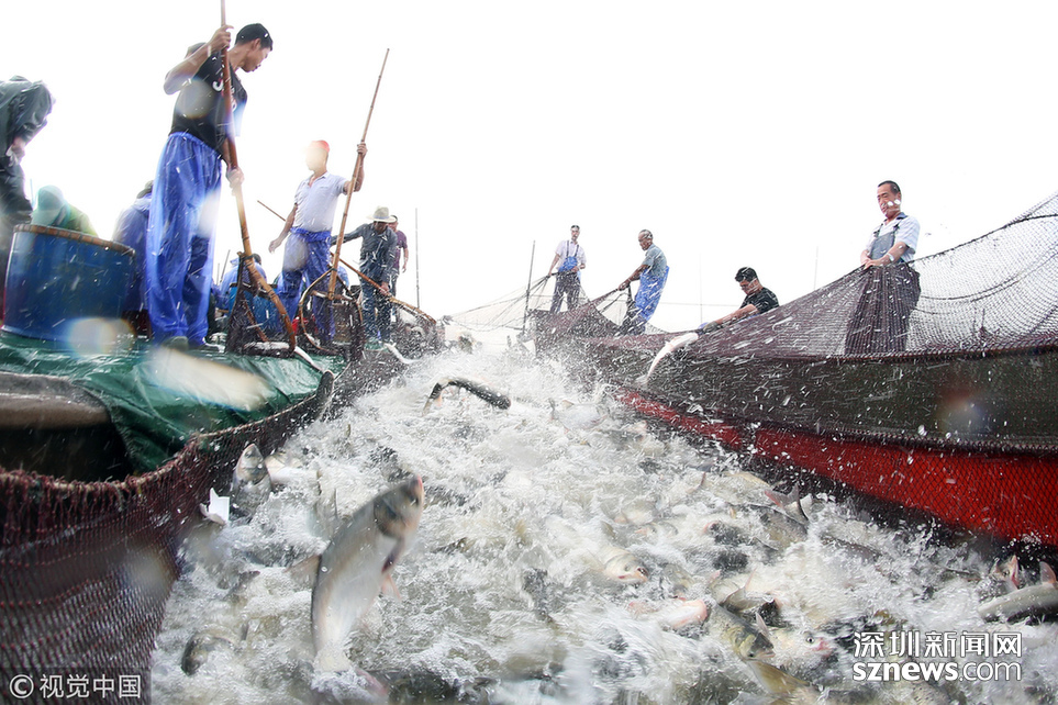 2018年6月26日,江蘇省常州市嘉澤鎮(zhèn)捕撈村的漁民組織夏季捕撈,一網(wǎng)魚(yú)達(dá)五萬(wàn)余斤,以鰱魚(yú)為主,供應(yīng)市場(chǎng)需求。夏捕的魚(yú)價(jià)較平時(shí)有所上漲,漁民粗略估計(jì)可增收上萬(wàn)余元。