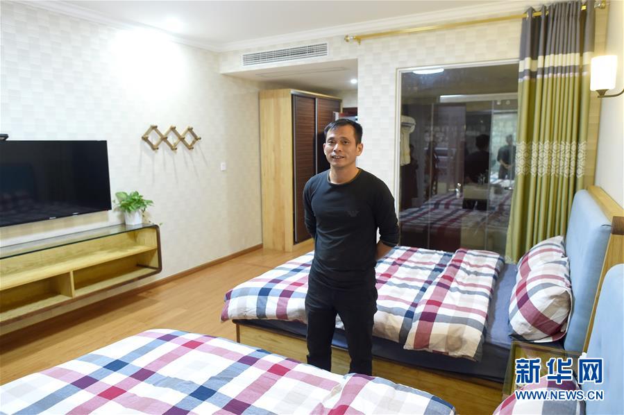 棠里塢村民宿負責人徐學德在民宿客房內(nèi)(10月16日攝)。 浙江諸暨市陳宅鎮(zhèn)棠里塢村積極盤活閑置資源,吸引社會資本參與鄉(xiāng)村振興。棠里塢村一處面積2000多平方米的廢棄豬場,經(jīng)過改造成為民宿,每到節(jié)假日客房供不應求。 新華社記者 韓傳號 攝