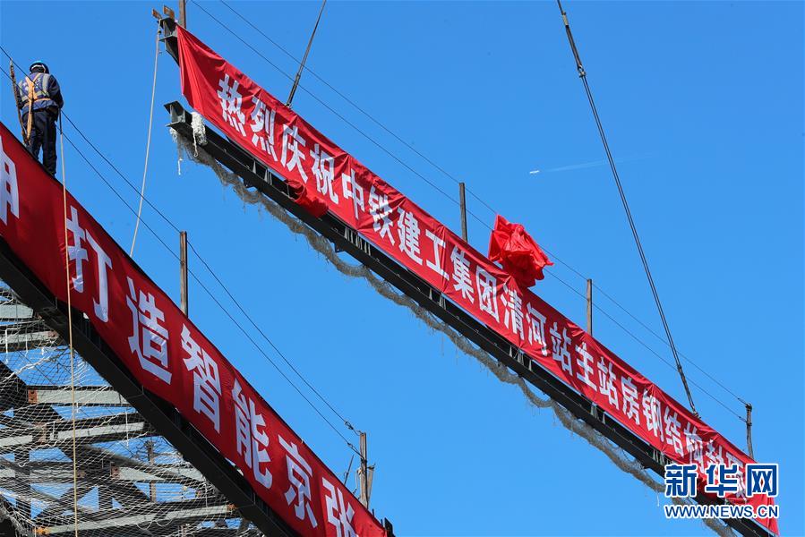 10月17日,工作人員在吊裝最后一組鋼梁。當(dāng)日,京張高鐵新建車站——清河站主體結(jié)構(gòu)正式封頂。清河站是京張高鐵建筑面積最大的車站,同時(shí)也是京張高鐵在北京地區(qū)的始發(fā)站之一。 新華社記者 張晨霖 攝