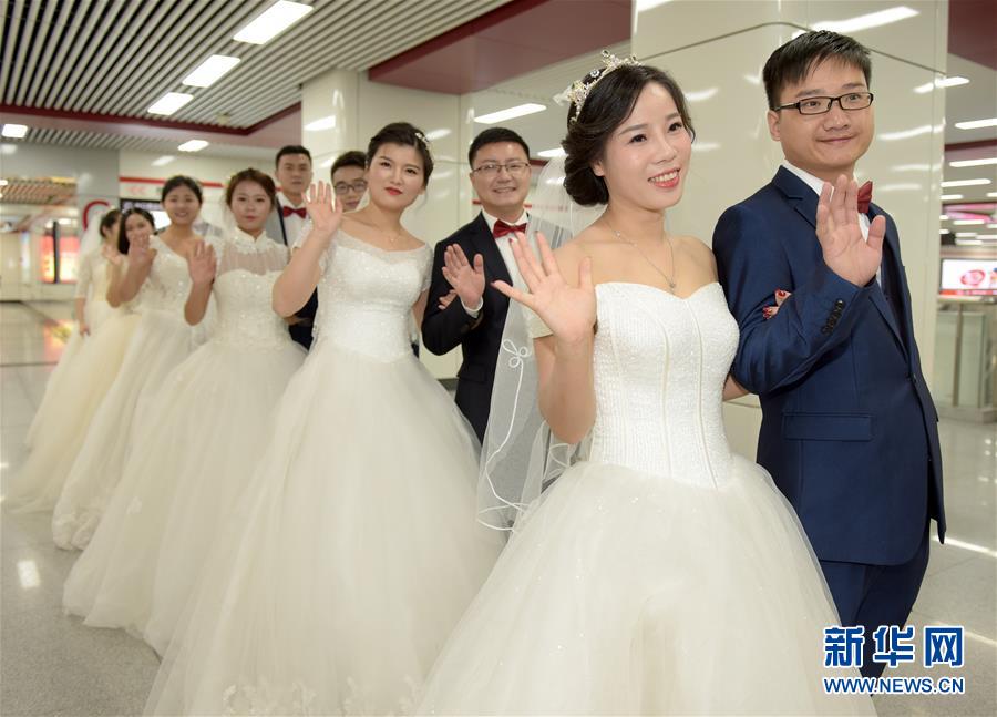 10月18日,在合肥市地鐵一號(hào)線,新人們準(zhǔn)備乘坐地鐵。當(dāng)日,中鐵四局集團(tuán)城市軌道交通工程分公司的18對(duì)新人在安徽合肥地鐵一號(hào)線的車廂里舉行了一場(chǎng)集體婚禮儀式。 新華社記者 郭晨 攝