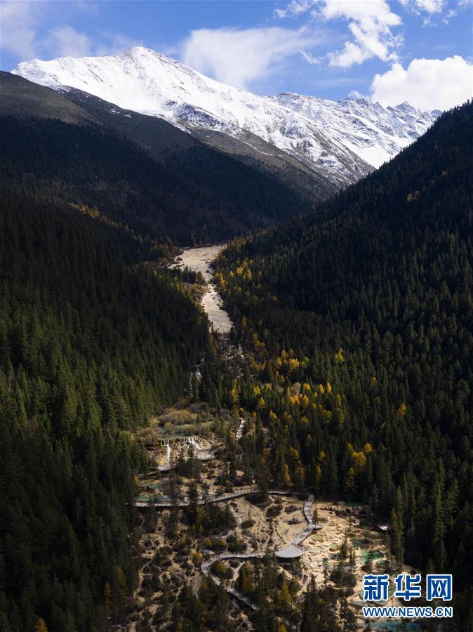 黃龍溝在藍天白云、雪山和彩林的映襯下風景如畫(10月19日無人機攝)。深秋時節(jié),在雪山、藍天、白云和彩林映襯下,黃龍溝中的彩池色彩更加斑斕,目前黃龍景區(qū)進入觀賞最佳時節(jié)。黃龍風景名勝區(qū)位于四川省松潘縣境內(nèi),以彩池、灘流、雪山、峽谷、森林等聞名,享有“人間瑤池”“圣地仙境”之美譽。新華社記者 江宏景攝