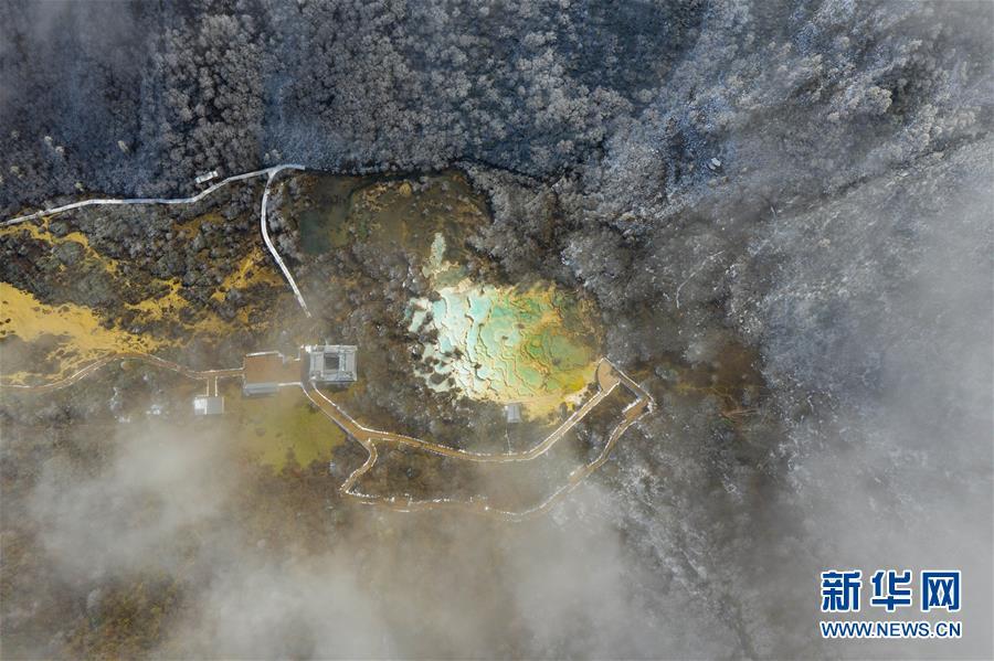 俯瞰黃龍溝五彩池和黃龍寺(10月19日無人機拍攝)。深秋時節(jié),在雪山、藍(lán)天、白云和彩林映襯下,黃龍溝中的彩池色彩更加斑斕,目前黃龍景區(qū)進入觀賞最佳時節(jié)。黃龍風(fēng)景名勝區(qū)位于四川省松潘縣境內(nèi),以彩池、灘流、雪山、峽谷、森林等聞名,享有“人間瑤池”“圣地仙境”之美譽。新華社記者 江宏景攝