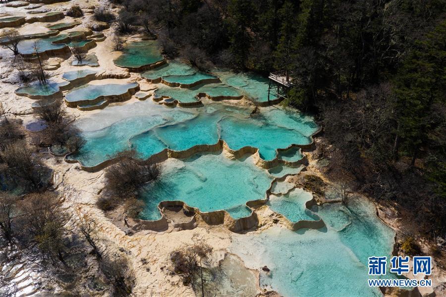 俯瞰黃龍溝爭艷池一角(10月19日無人拍機攝)。深秋時節(jié),在雪山、藍天、白云和彩林映襯下,黃龍溝中的彩池色彩更加斑斕,目前黃龍景區(qū)進入觀賞最佳時節(jié)。黃龍風景名勝區(qū)位于四川省松潘縣境內,以彩池、灘流、雪山、峽谷、森林等聞名,享有“人間瑤池”“圣地仙境”之美譽。新華社記者 江宏景攝