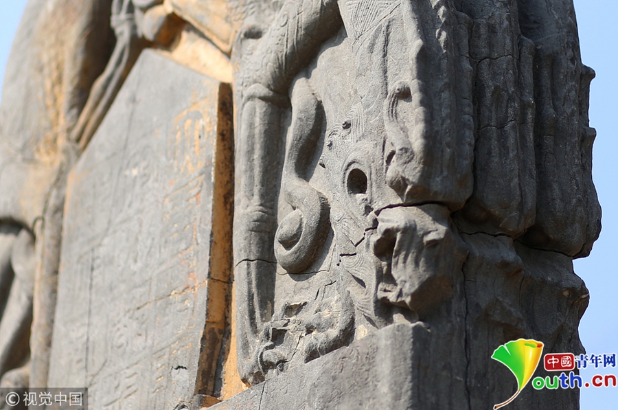 這塊唐代碑的碑額上刻寫著大唐故贈(zèng)安州都督鄭府君碑,碑高2.30米,寬1.12米,厚0.27米,以整塊青石刻寫雕鑿而成,碑額兩端共有六條螭首,雕刻手法精細(xì)入微,雖歷經(jīng)1300多年風(fēng)雨的蝕侵,但依舊能看出昔日的精美。圖片來源:視覺中國