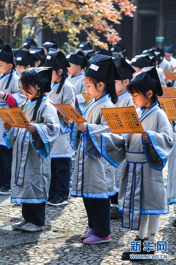 10月23日,學生們在誦讀國學經(jīng)典。當日,浙江省長興縣第八小學舉行“誦家規(guī)家訓,傳中華美德”校園“誠敬日”主題教育活動,通過誦讀國學經(jīng)典、講勵志故事、演美德戲劇等形式,讓學生感受優(yōu)秀傳統(tǒng)文化。近年來,該學校立足“誠敬”文化,注重國學啟蒙教育,讓學生從小培養(yǎng)“以誠立身、以敬處事”的良好品質(zhì)。新華社記者 徐昱 攝