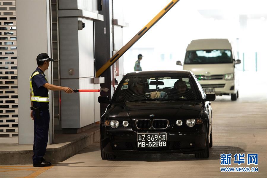 10月24日,首輛私家車在澳門口岸離境車道上通關(guān)。當(dāng)日9時(shí),港珠澳大橋正式通車。 新華社記者張金加攝