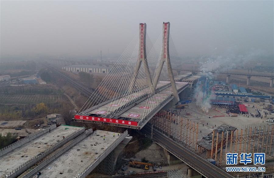 10月25日,唐山市二環(huán)路項(xiàng)目上跨津山鐵路斜拉橋轉(zhuǎn)體成功(無(wú)人機(jī)拍攝)。 當(dāng)日,河北省唐山市二環(huán)路項(xiàng)目上跨津山鐵路斜拉橋轉(zhuǎn)體成功。據(jù)介紹,該橋總長(zhǎng)927.5米,主橋由斜拉轉(zhuǎn)體橋和轉(zhuǎn)體T構(gòu)橋組成,轉(zhuǎn)體總重5.1萬(wàn)噸,其中斜拉轉(zhuǎn)體橋重3.3萬(wàn)噸,主塔高達(dá)80.5米,為曲線變截面“雙人字”形空心塔,自上而下共有128根斜拉索。 新華社記者楊世堯攝