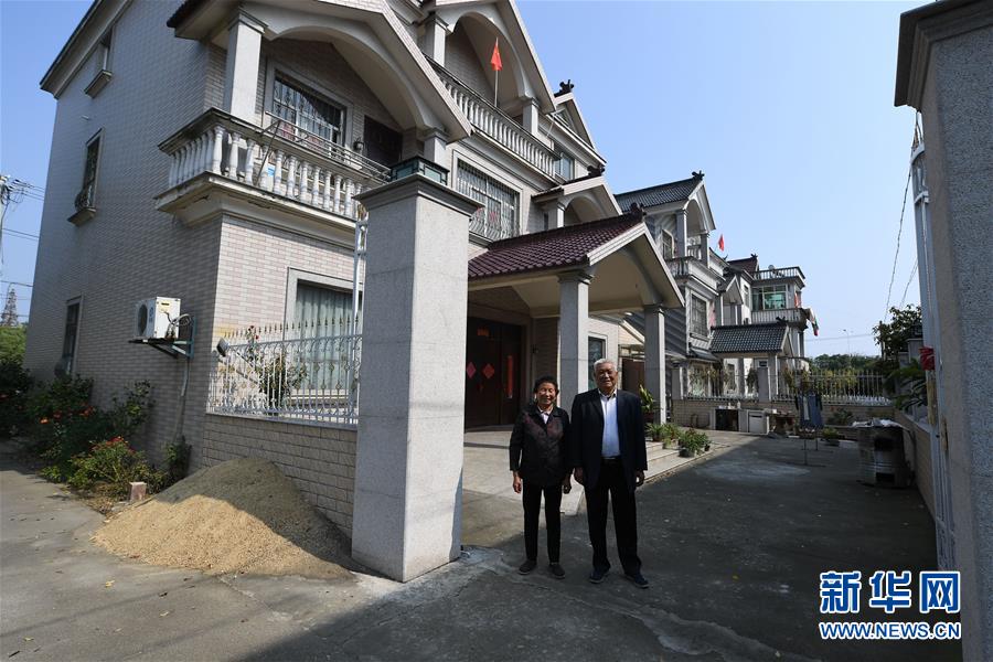現年72歲的姚苗英(左)與丈夫在自家新修建的樓房前留影(10月23日攝)。姚苗英家的老房因修建公路拆遷,新房是在村里統(tǒng)一規(guī)劃下新址新建。 新華社記者 季春鵬攝