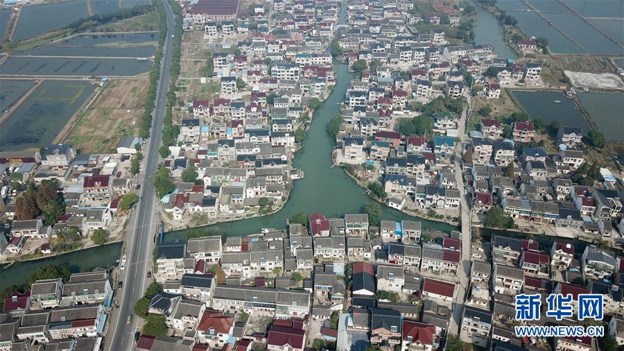 開弦弓村村貌(10月23日無(wú)人機(jī)拍攝)。小清河穿村而過,從高空俯瞰,南村河道像張弓,北村河道像支箭,村名由此而來(lái)。 新華社記者 季春鵬攝