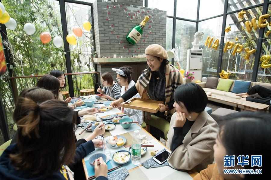 在浙江省杭州市外桐塢村,民宿主人龐代君(右三)在她創(chuàng)立于2016年的“畫·鄉(xiāng)院”精品民宿為客人送早餐(2018年1月3日攝)。外桐塢村是西湖西面群山中的一個小村落,傳統(tǒng)以茶葉生產(chǎn)為主要經(jīng)濟來源,自2010年以來著力打造藝術(shù)村落,目前已擁有藝術(shù)家工作室43個、高檔民宿7家、美術(shù)館和展廳3家。新華社記者 翁忻旸 攝
