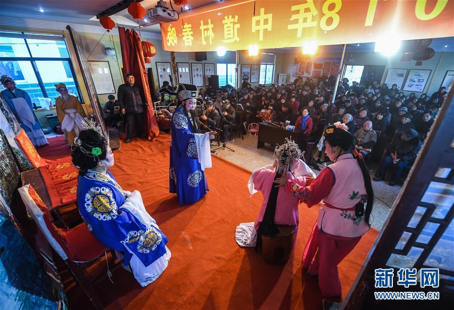 2018年2月6日,長興風(fēng)華藝術(shù)團的演員們?yōu)楹闃蜴?zhèn)中道村的村民們演出越劇。據(jù)了解,長興縣每年都會安排100多場“送戲下鄉(xiāng)”活動,滿足村民的精神文化需求。新華社記者 徐昱 攝