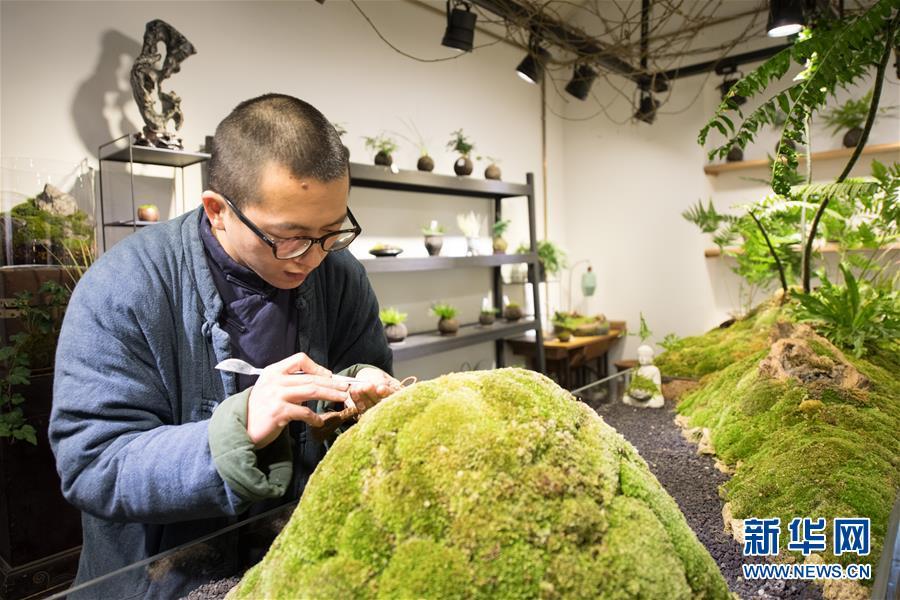 安徽籍藝術(shù)家潘銳在2012年創(chuàng)立于杭州市外桐塢村的“植覺”工作室打點苔蘚盆景(2018年1月14日攝)。外桐塢村是西湖西面群山中的一個小村落,傳統(tǒng)以茶葉生產(chǎn)為主要經(jīng)濟來源。自2010年以來,外桐塢村著力打造藝術(shù)村落。 新華社記者 翁忻旸 攝