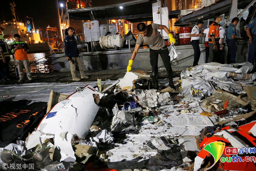 搜救人員打撈上來(lái)飛機(jī)的殘骸。