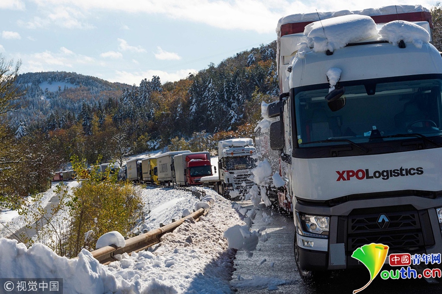 當(dāng)?shù)貢r間2018年10月30日,法國菲克斯圣熱內(nèi),當(dāng)?shù)赝唤荡笱瑢?dǎo)致950人被困在大雪覆蓋的公路上,不得不睡在緊急救援中心。法國國家氣象局已經(jīng)將當(dāng)?shù)刂糜诔壬踩渲隆?/p>