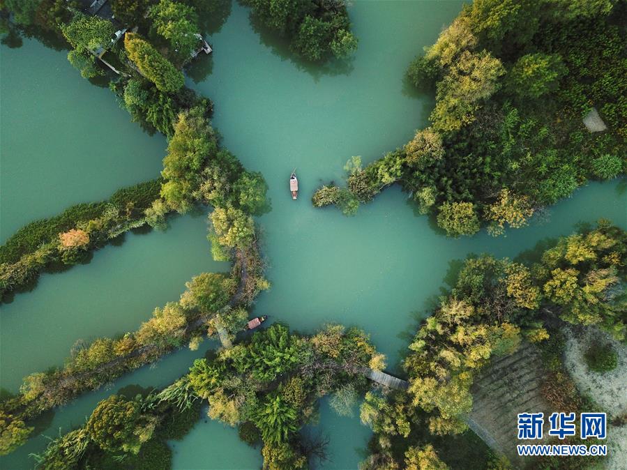 10月29日,游船行駛在西溪濕地河道上(無人機拍攝)。 新華社記者翁忻旸攝