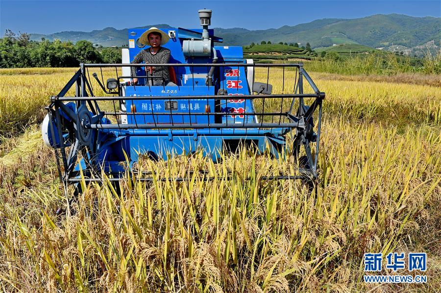 深秋時(shí)節(jié),福建省武夷山市興田鎮(zhèn)南岸村農(nóng)民在搶收稻谷,田間呈現(xiàn)一派豐收景象。