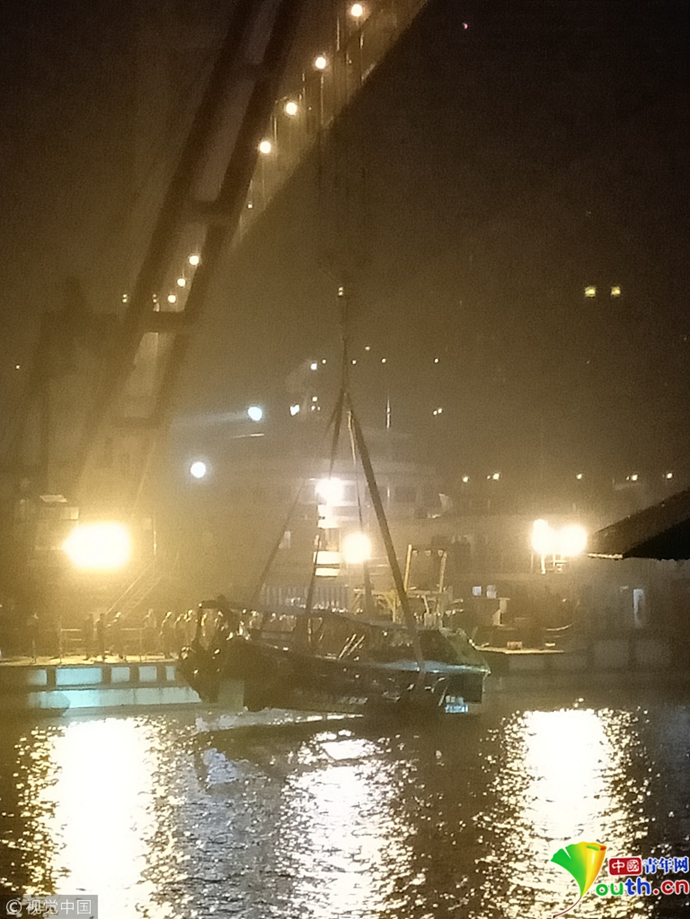 10月31日晚,重慶萬州長江二橋墜江公交車被打撈出水。記者在重慶萬州墜江公交車救援現(xiàn)場看見,公交車被四條繩索從四個方向包圍,車身明顯變形,車窗玻璃全部破裂。