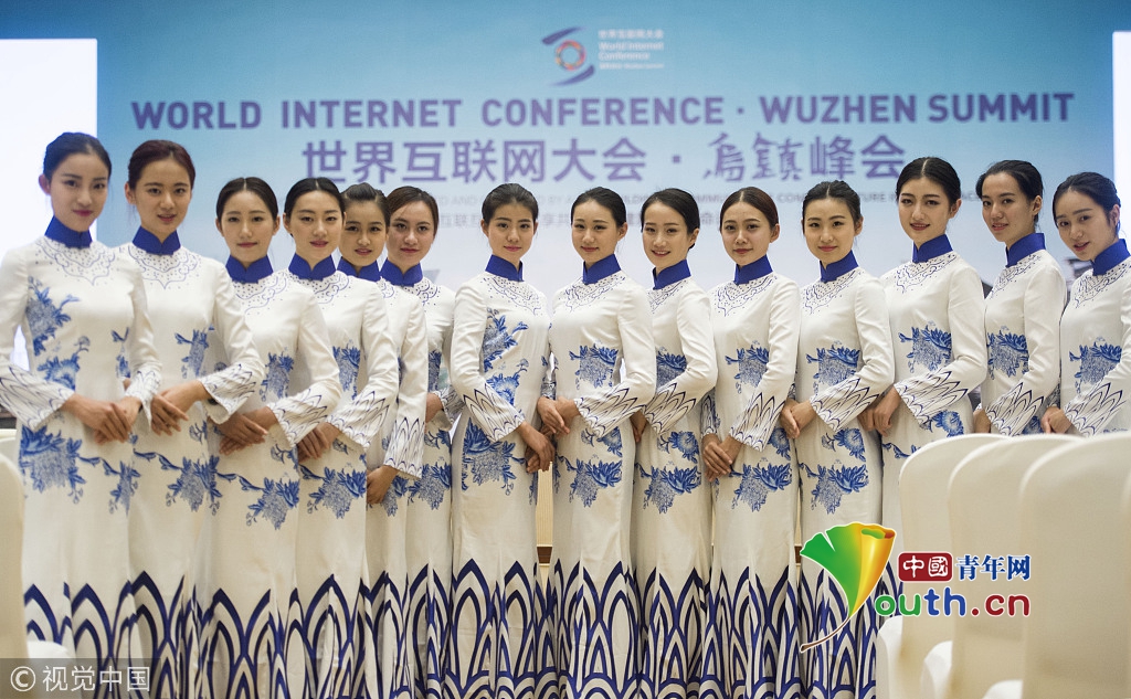 2014年11月17日,世界互聯(lián)網(wǎng)大會直播演練在浙江烏鎮(zhèn)舉行。來自浙江傳媒學(xué)院的大學(xué)生們,身著一襲青花瓷紋旗袍亮相,顯得分外嫵媚,引人注目。