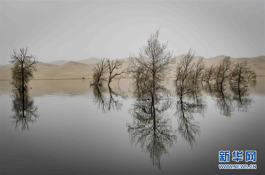 在位于新疆巴音郭楞蒙古自治州尉犁縣的一處名叫“羅布湖”的海子里,幾棵胡楊的倒影映在水中(10月17日攝)。 新華社記者 趙戈 攝