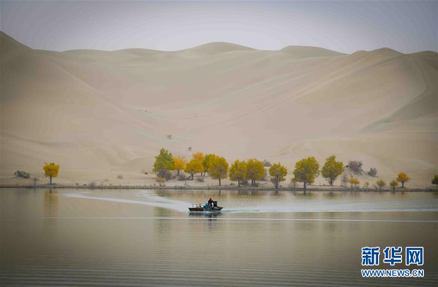 在位于新疆巴音郭楞蒙古自治州尉犁縣的一處名叫“羅布湖”的海子里,漁民在捕魚(10月17日攝)。 新華社記者 趙戈 攝