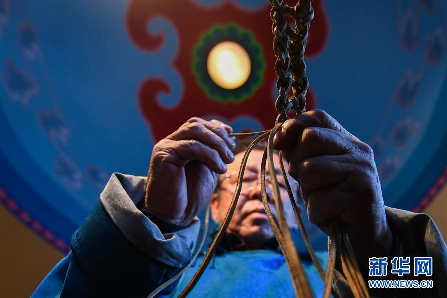 10月31日,在內蒙古自治區(qū)通遼市科爾沁左翼后旗,套格敦白乙在工作室里編織馬肚帶。新華社記者劉磊攝