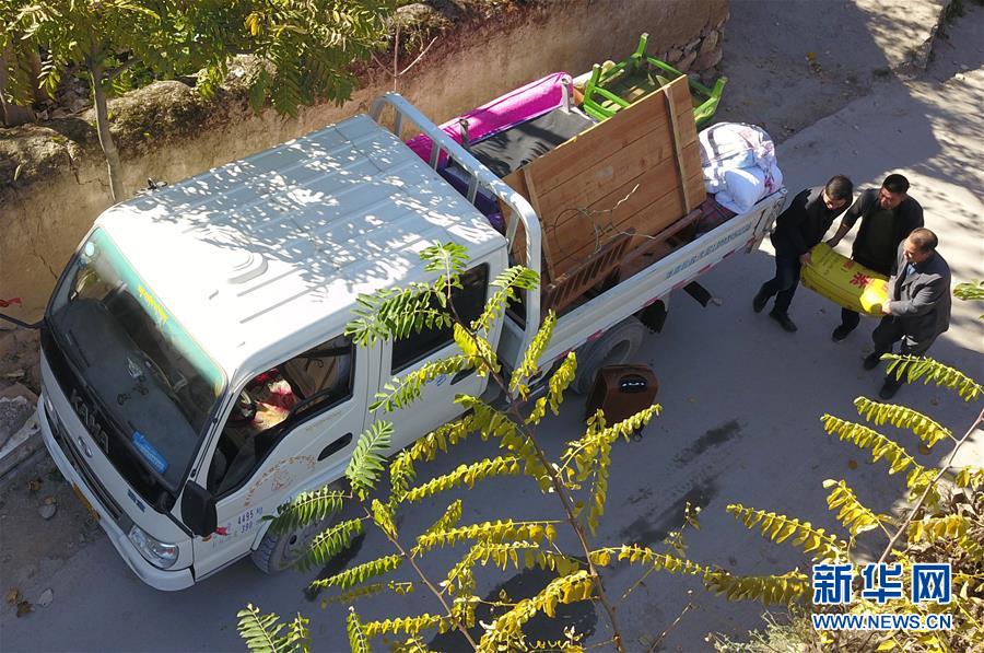 在隴南市武都區(qū)“新坪埡”,村民將山上搬下來的物品搬進(jìn)新房(10月31日攝)。新華社記者 范培珅攝