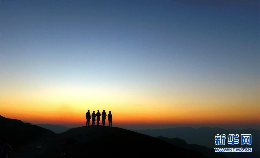 11月2日,游客在摩天嶺草場欣賞夕陽景色(無人機(jī)拍攝)。金秋時(shí)節(jié),廣西融水苗族自治縣桿洞鄉(xiāng)堯告村的摩天嶺草場天高云淡,景色迷人。新華社記者周華攝