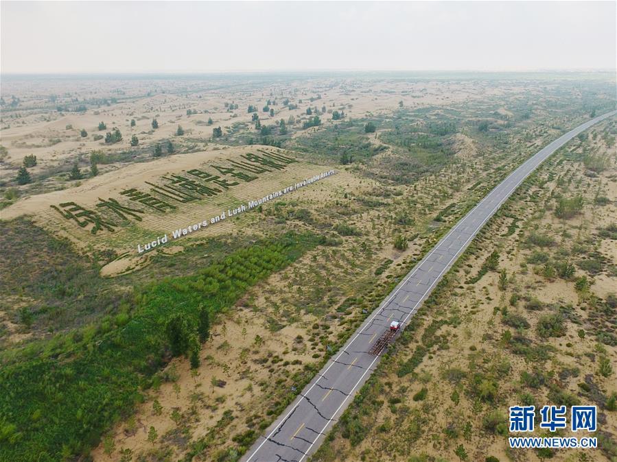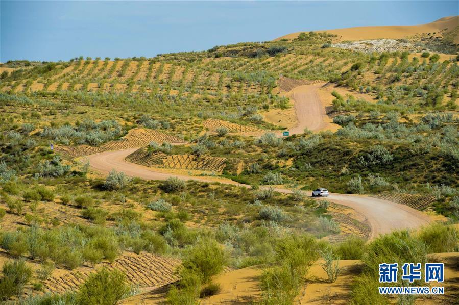 庫布其沙漠中的一條穿沙公路,兩旁綠意盎然(8月1日無人機(jī)拍攝)。 新華社記者劉磊攝