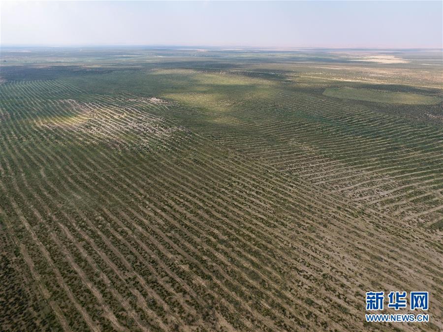 庫布其沙漠中的人工沙障(8月2日無人機(jī)拍攝)。 新華社記者劉磊攝