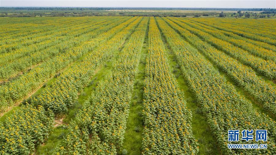 內(nèi)蒙古杭錦旗沙日召嘎查牧民白音道爾計(jì)種植的甘草等沙生植物(7月31日無人機(jī)拍攝)。 新華社記者劉磊攝