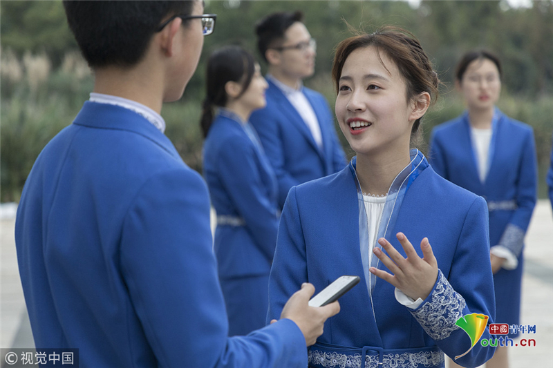2018年11月1日,浙江省桐鄉(xiāng)市,第五屆世界互聯(lián)網(wǎng)大會(huì)志愿者“小梧桐”出征。圖片作者:王振宇/視覺中國(guó)