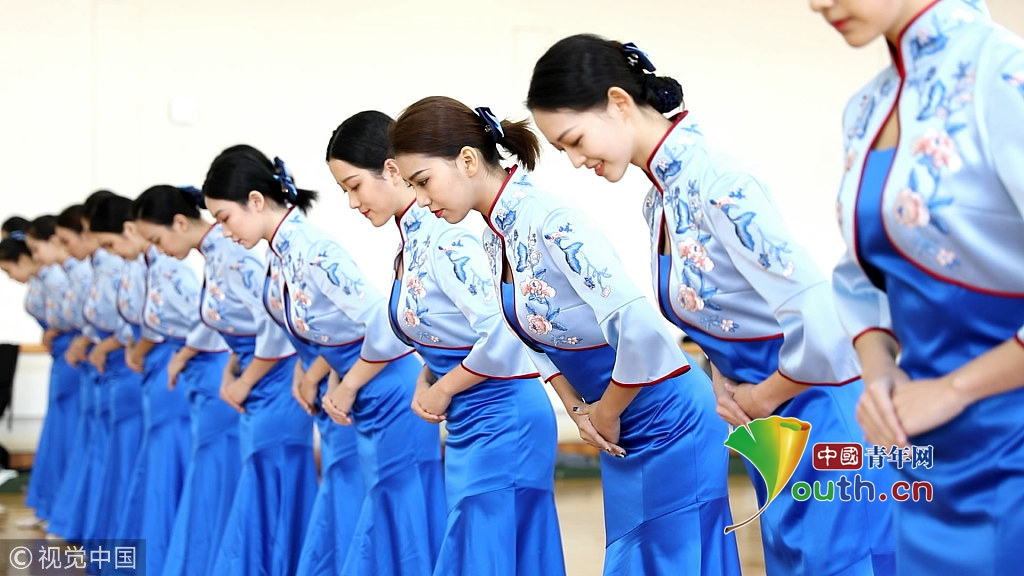 2018年10月15日,杭州,第五屆世界互聯(lián)網(wǎng)大會(huì)召開在即,來自浙江傳媒學(xué)院的禮儀志愿者們正在進(jìn)行緊張有序的集中訓(xùn)練。圖片作者:浙江日?qǐng)?bào) 馮賀/視覺中國(guó)