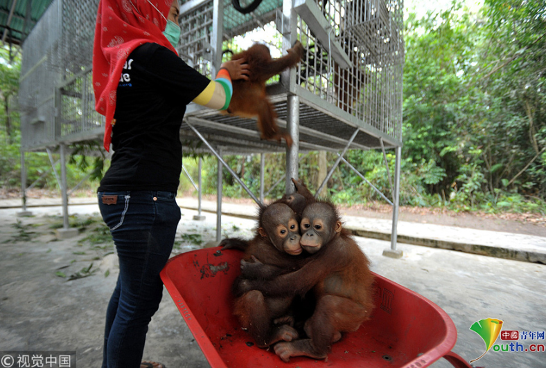 當(dāng)?shù)貢r(shí)間2018年9月18日,印尼加里曼丹克塔邦,國(guó)際動(dòng)物救援(IAR)猩猩安全與保護(hù)中心里,飼養(yǎng)員用獨(dú)輪車把猩猩寶寶送到森林學(xué)校。圖片作者:Newscom