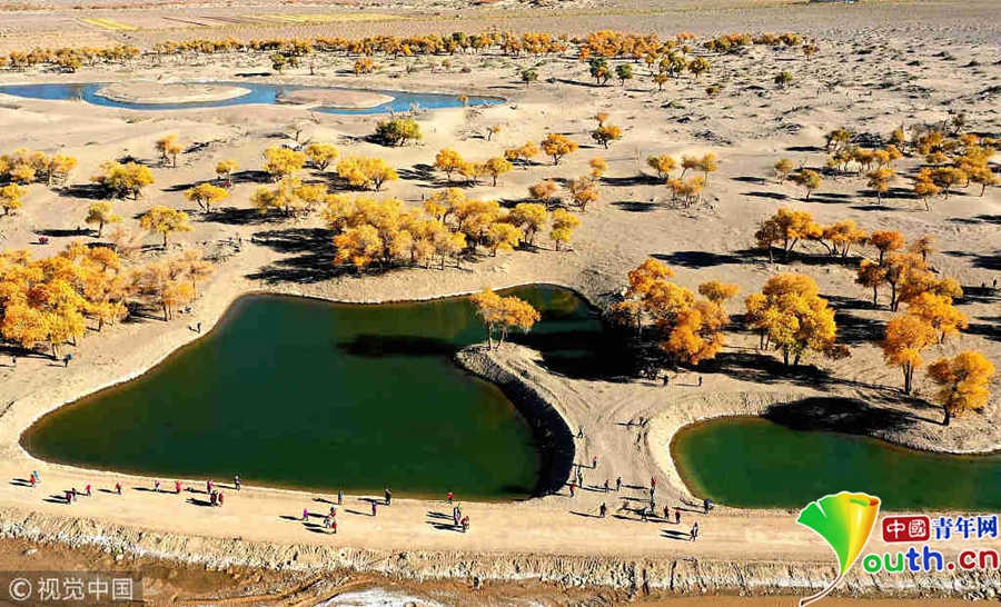 中國(guó)青年網(wǎng)北京10月9日電 2018年10月7日至8日,內(nèi)蒙古自治區(qū)阿拉善盟額濟(jì)納旗,地處巴丹吉林沙漠。額濟(jì)納河兩岸壯觀(guān)的胡楊林堪稱(chēng)大漠的一顆綠色明珠,每年深秋時(shí)節(jié)的第一場(chǎng)秋霜過(guò)后,大片的胡楊樹(shù)葉由綠變黃,一眼望去,陽(yáng)光下金色的樹(shù)葉襯著湛藍(lán)的天空于風(fēng)中婆娑起舞,鮮明的影調(diào),亮麗的色彩,令人流連忘返。