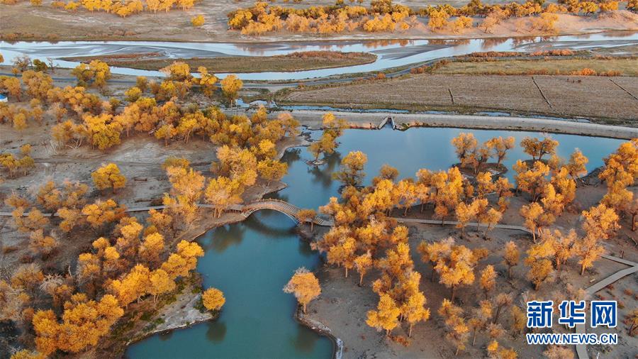 這是在內(nèi)蒙古自治區(qū)額濟納旗拍攝的胡楊林(10月10日無人機拍攝)。 金秋時節(jié),內(nèi)蒙古自治區(qū)額濟納旗胡楊林如同披上金裝,成為大漠中的一抹亮色,吸引眾多中外游客前來觀賞游玩。 新華社記者鄒予攝