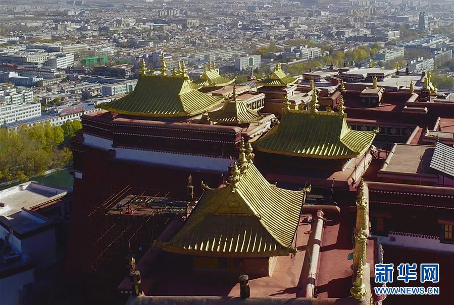 修繕后的布達拉宮金頂群(11月7日無人機拍攝)。新華社記者普布扎西 攝