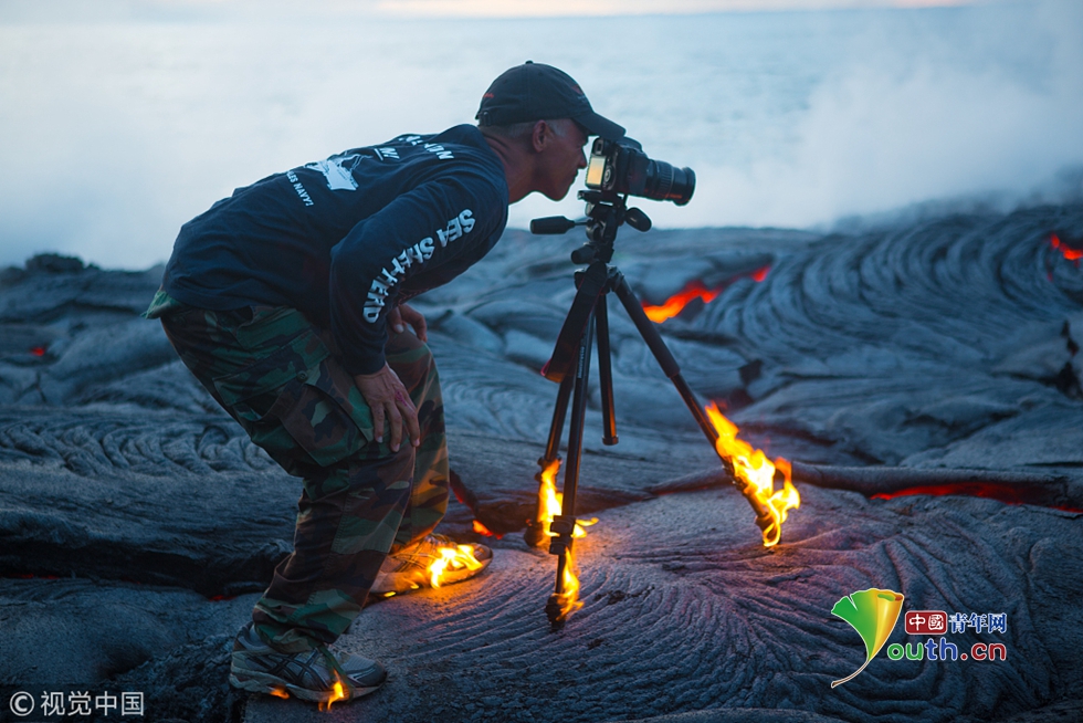 距離巖漿如此之近拍照十分危險。攝影師Kawika Singson在拍攝過程中,經(jīng)歷了極大的危險。流入海洋的巖漿量,風(fēng)向,以及巖漿基床的結(jié)實(shí)程度等風(fēng)險都需要考慮。 圖片來源:視覺中國