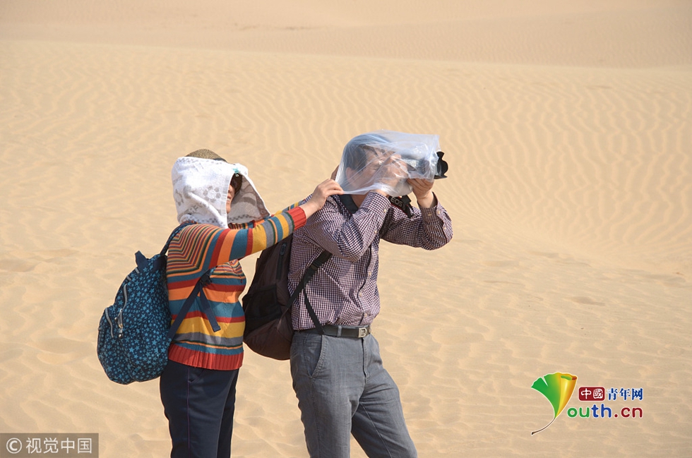 2013年05月05日,河北省張家口市,懷來天漠景區(qū)里的一名全副武裝的攝影師在風(fēng)中拍攝?!D片作者:蘇衛(wèi)忠/視覺中國