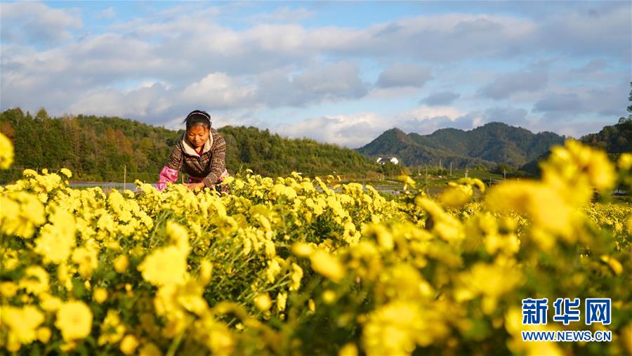 11月8日,婺源縣思口鎮(zhèn)農(nóng)戶在采摘皇菊。 新華社記者 胡晨歡 攝